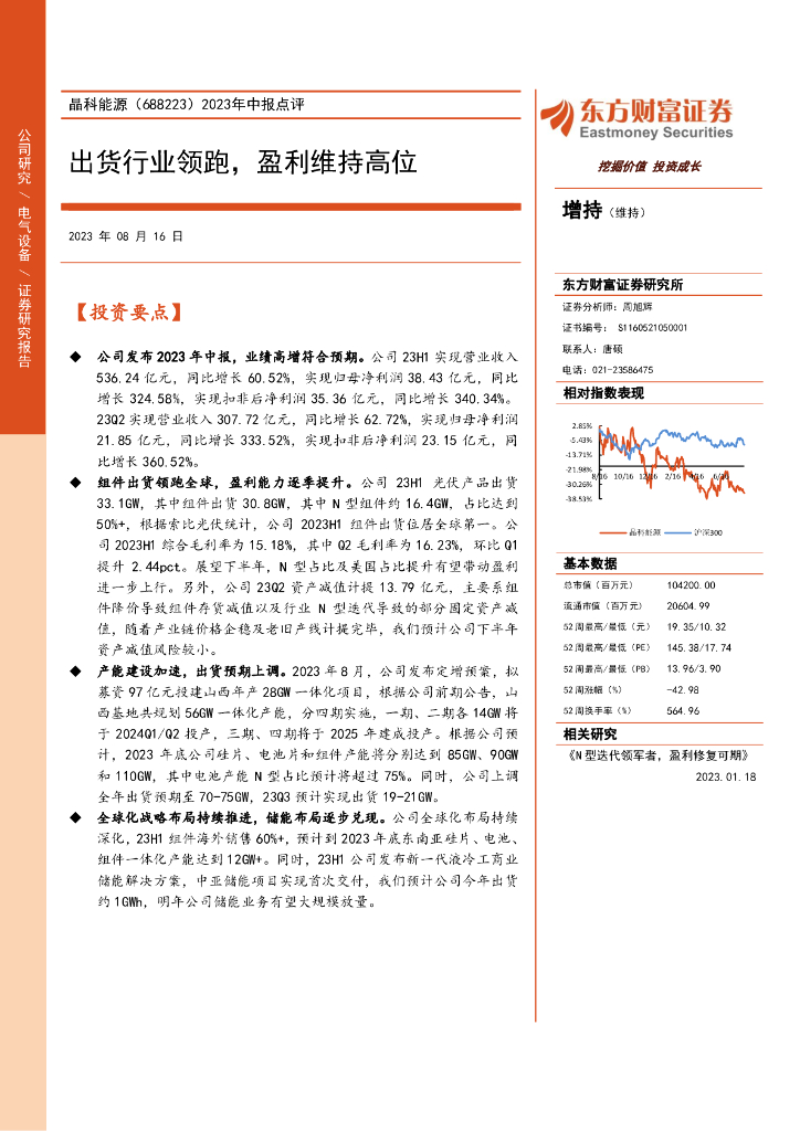 东方财富证券:晶科能源(688223)-2023年中报点评:出货行业领跑,盈利维持高位.pdf