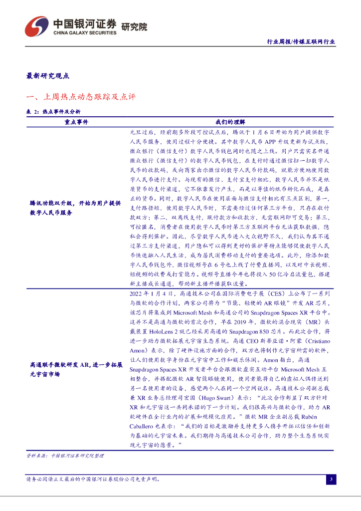 中国银河:传媒互联网行业:腾讯开始为用户提供数字人民币服务,高通联手微软研发AR.pdf