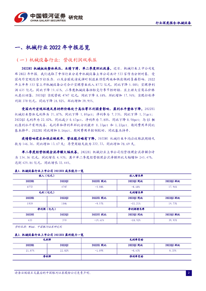 中国银河:机械设备行业2022年中报总结:业绩整体承压,细分板块分化明显.pdf