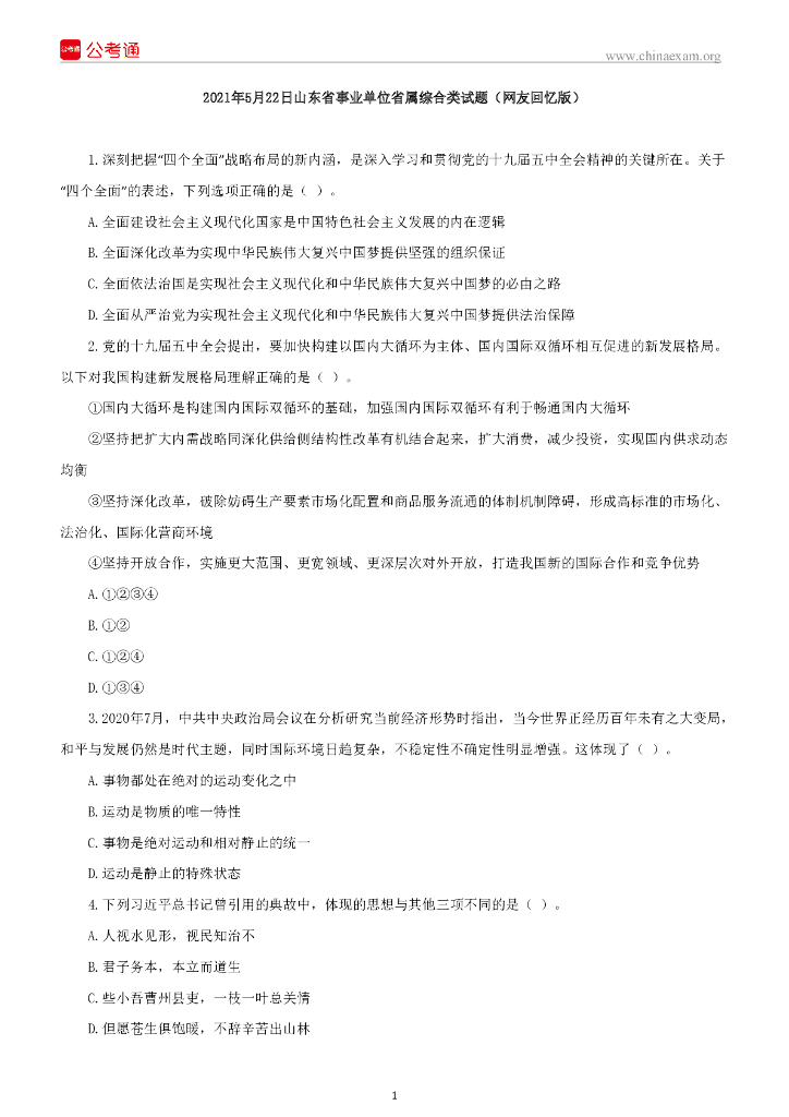 2021年5月22日山东省事业单位省属综合类试题(网友回忆版).pdf