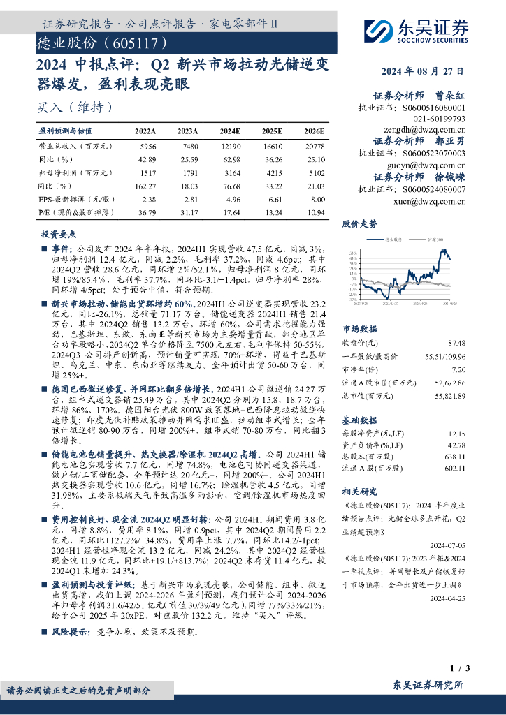 东吴证券:德业股份(605117)-2024中报点评:Q2新兴市场拉动光储逆变器爆发,盈利表现亮眼.pdf