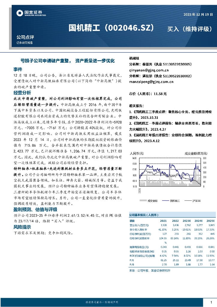 国金证券:国机精工(002046)-亏损子公司申请破产重整, 资产质量进一步优化.pdf