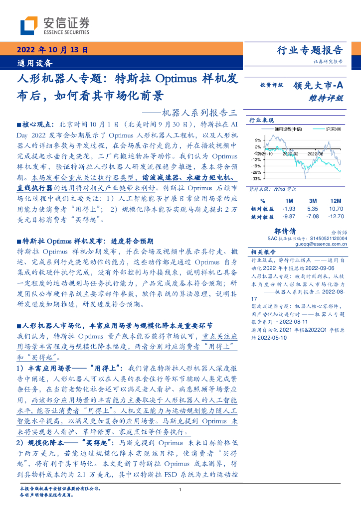 安信证券:通用设备:机器人系列报告三:特斯拉Optimus样机发布后,如何看其市场化前景.pdf