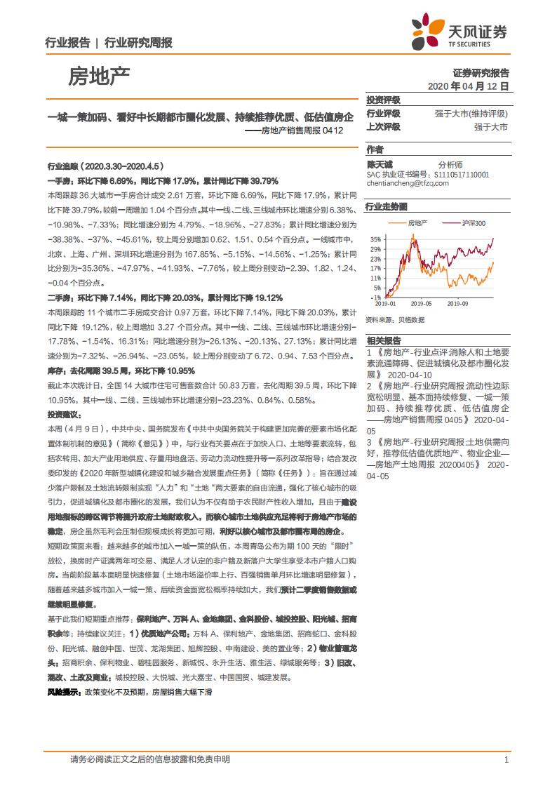 天风证券:房地产销售周报:一城一策加码、看好中长期都市圈化发展、持续推荐优质、低估值房企.pdf