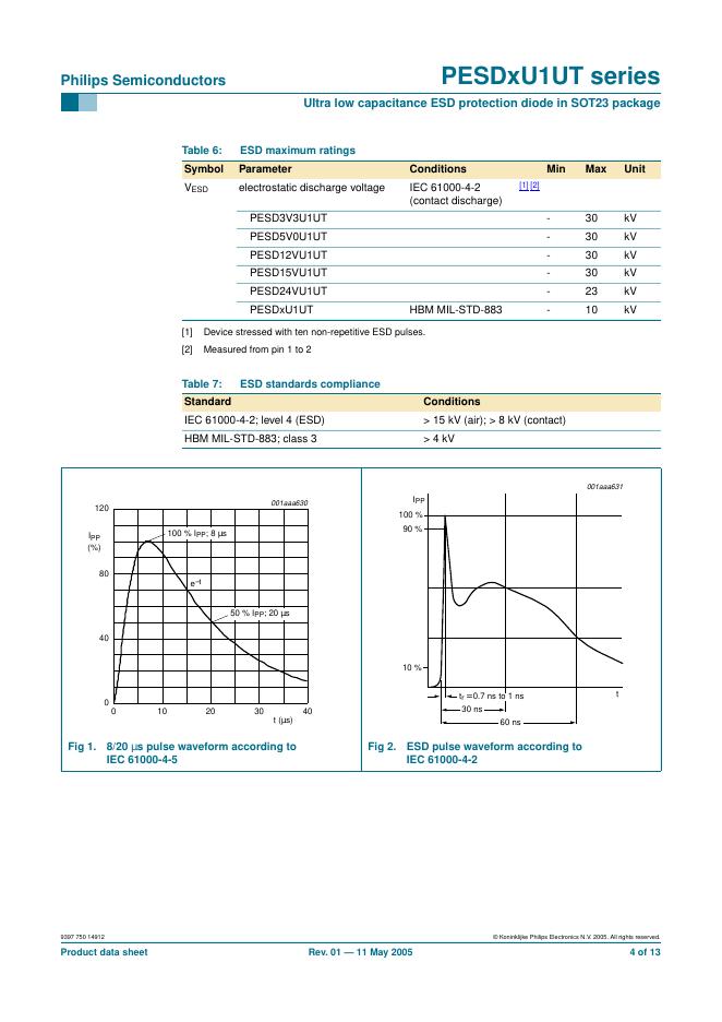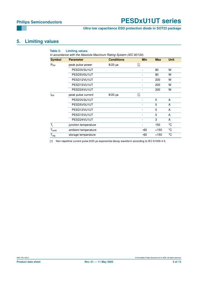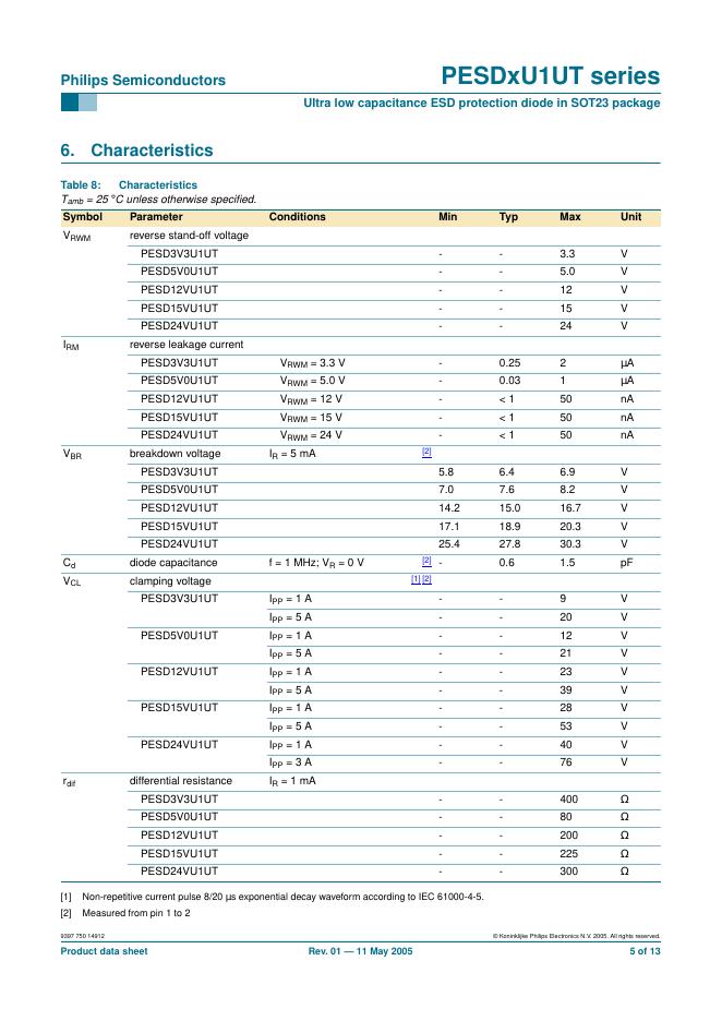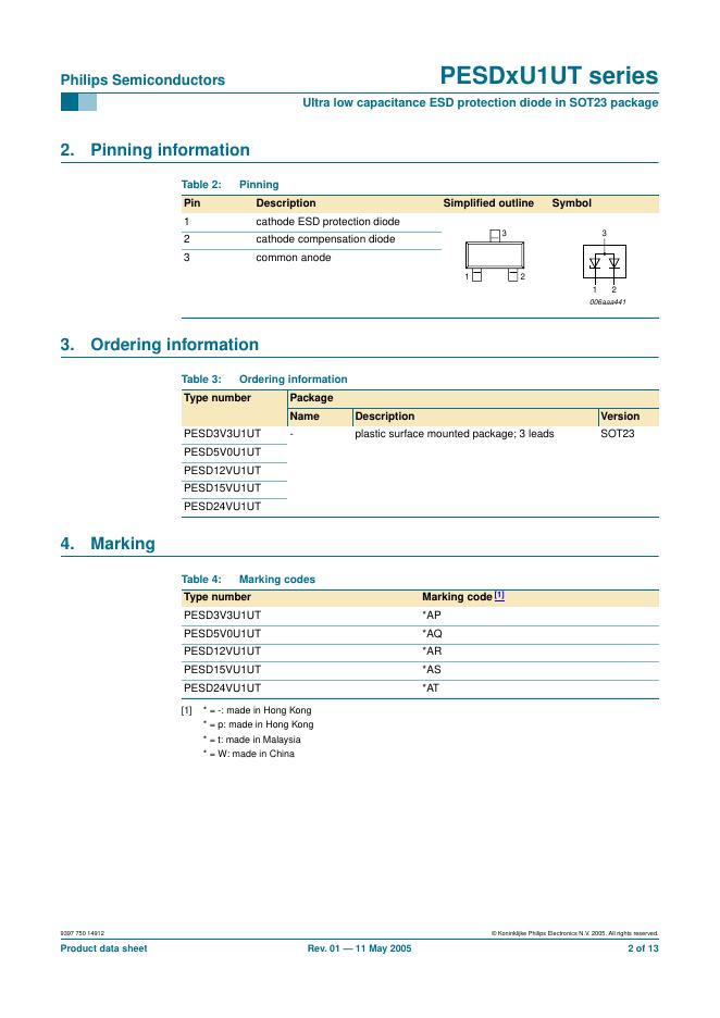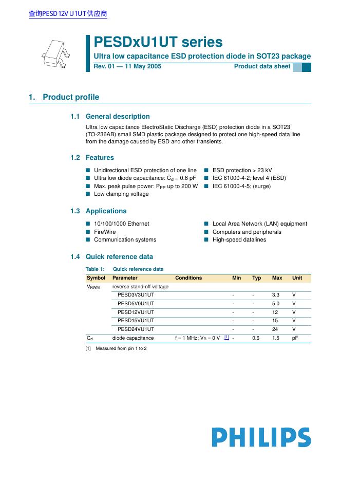 PHILIPS PESDxU1UT series Ultra low capacitance ESD protection diode in SOT23 package 数据手册.pdf