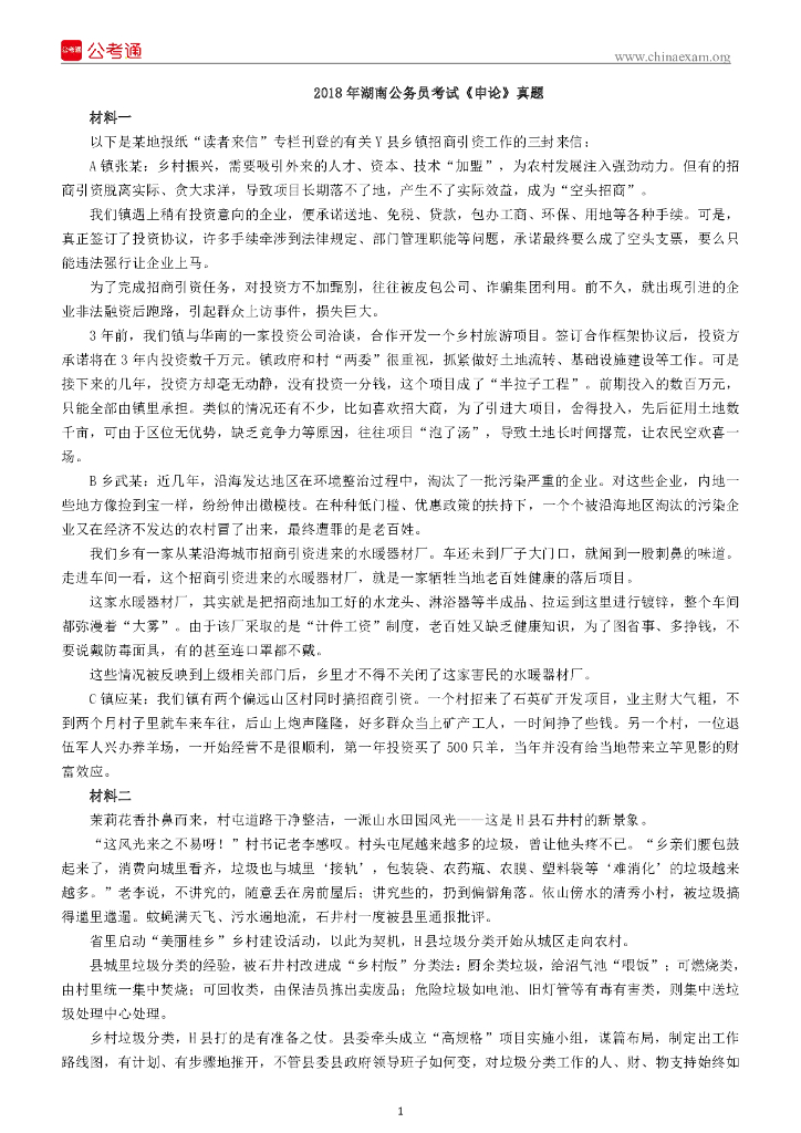 2018年湖南公务员考试申论真题及答案(乡镇卷).pdf