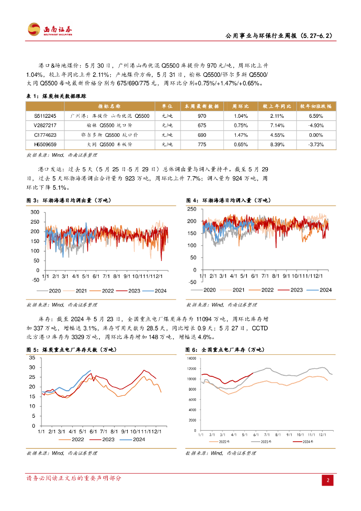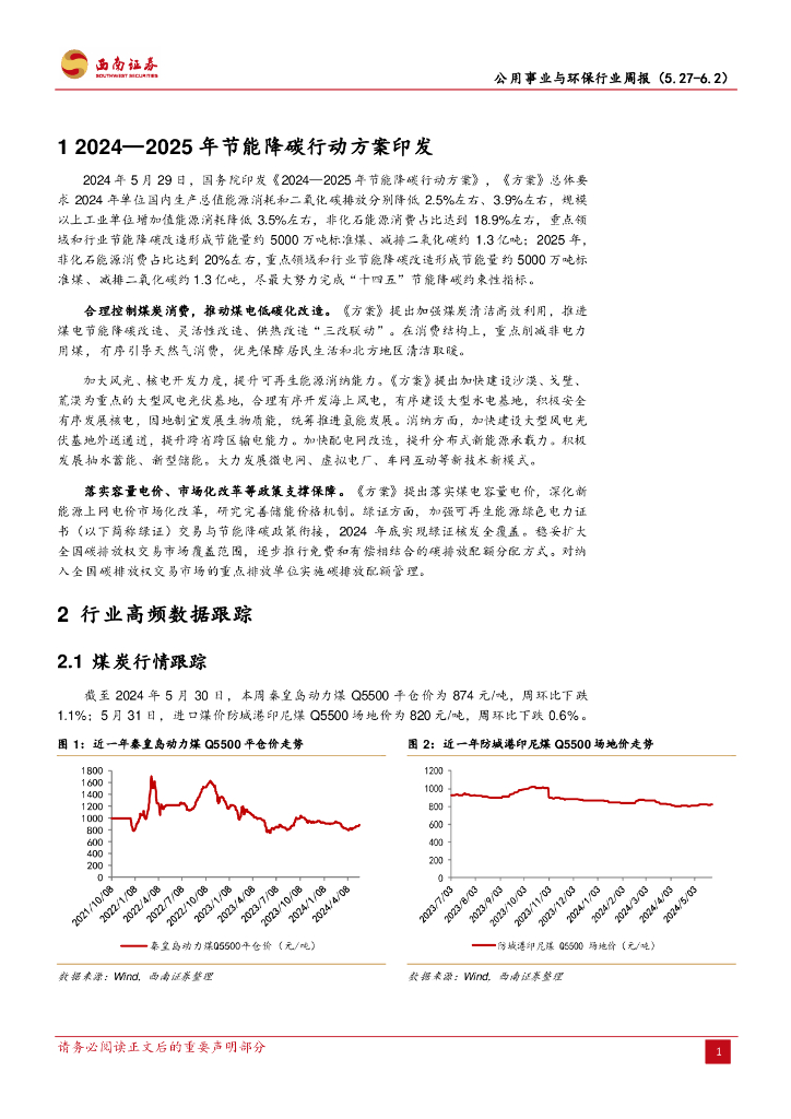 西南证券:公用事业与环保行业周报:《2024-2025年节能降碳行动方案》印发,煤价逐渐企稳.pdf