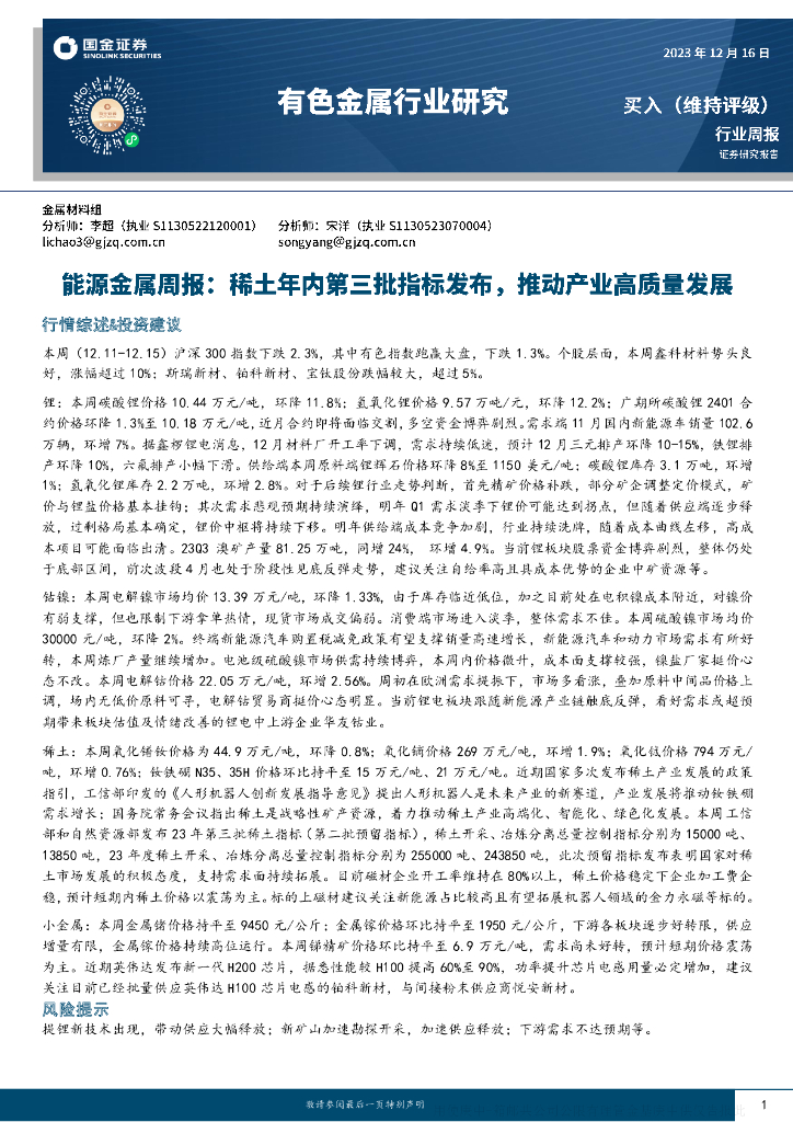 国金证券:能源金属周报:稀土年内第三批指标发布,推动产业高质量发展.pdf