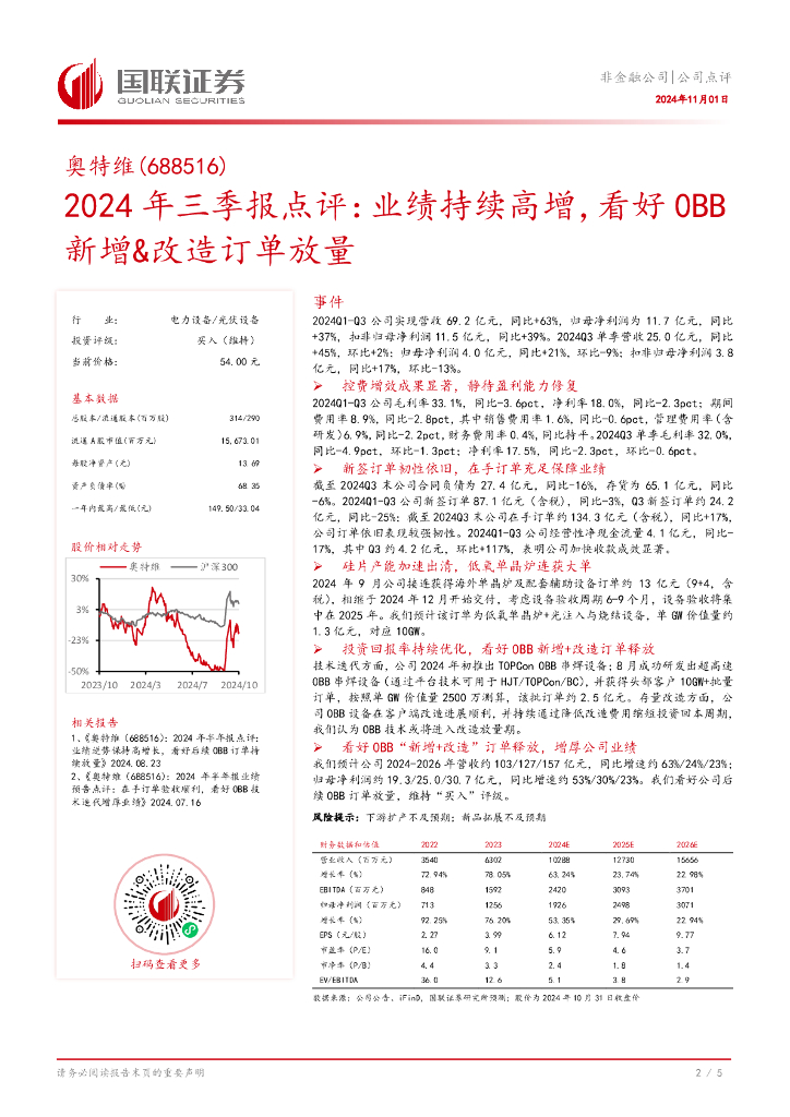 国联证券:奥特维(688516)-2024年三季报点评:业绩持续高增,看好0BB新增&改造订单放量.pdf