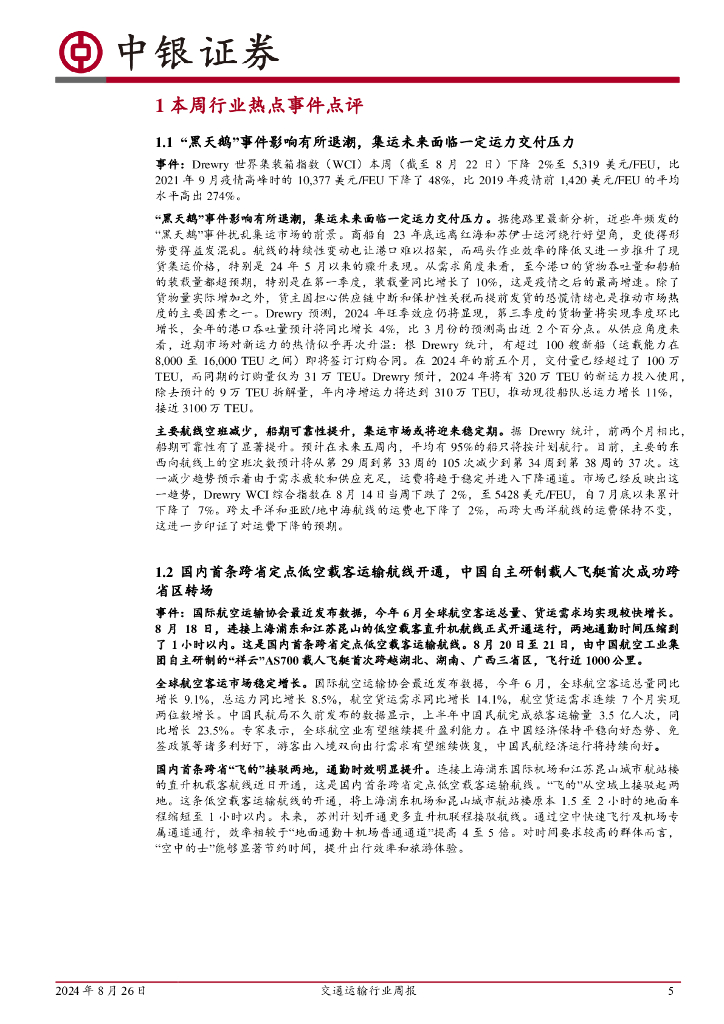中银证券:交通运输行业周报:国内首条跨省定点低空载客运输航线开通,7月快递业务量同比增长超两成.pdf