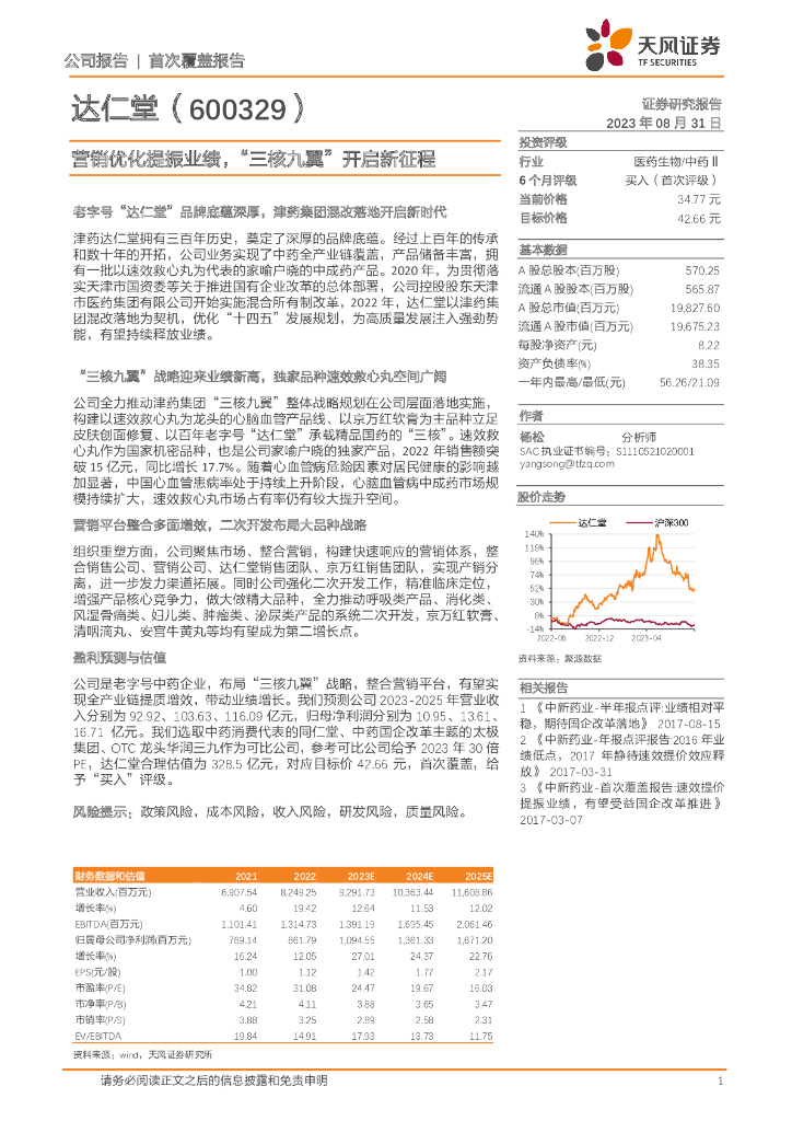 天风证券:达仁堂(600329)-营销优化提振业绩,“三核九翼”开启新征程.pdf