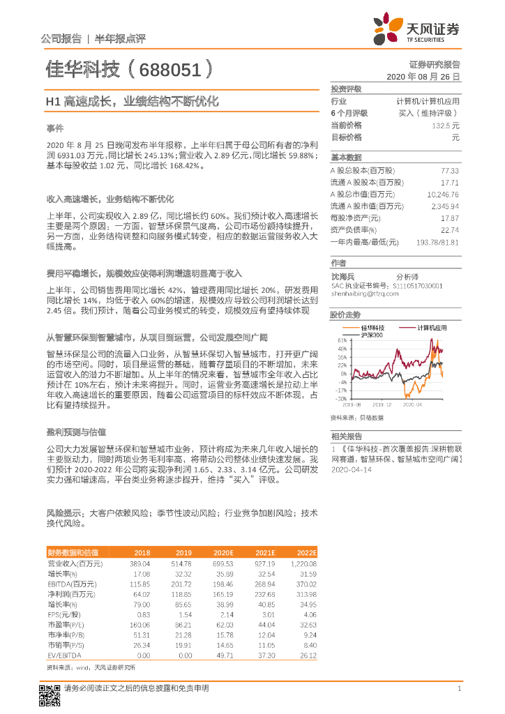 天风证券:佳华科技(688051)-H1高速成长,业绩结构不断优化.pdf