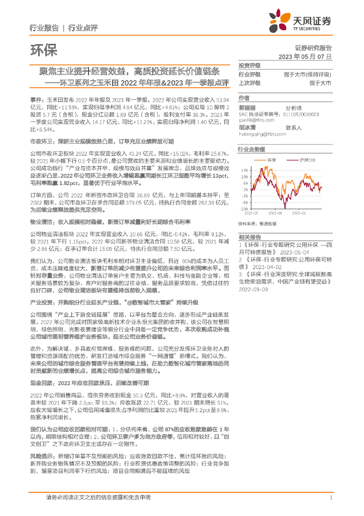 天风证券:环卫系列之玉禾田2022年年报&2023年一季报点评:聚焦主业提升经营效益,高质投资延长价值链条.pdf