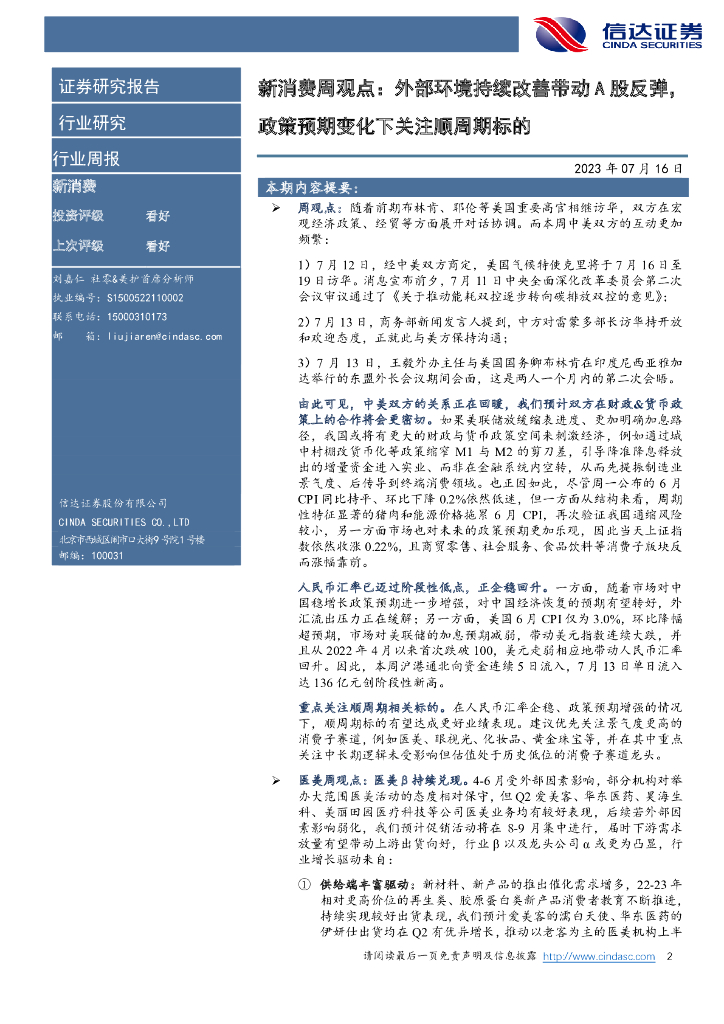 信达证券:新消费周观点:外部环境持续改善带动A股反弹,政策预期变化下关注顺周期标的.pdf