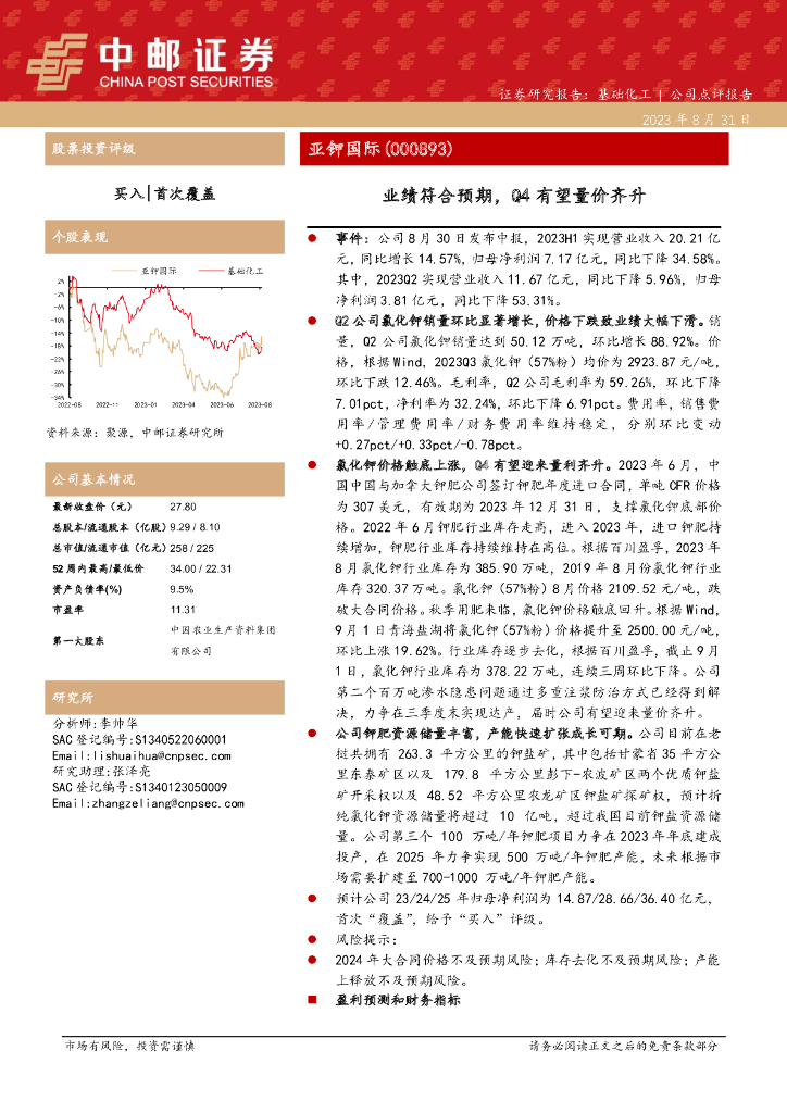 中邮证券:亚钾国际(000893)-业绩符合预期,Q4有望量价齐升.pdf