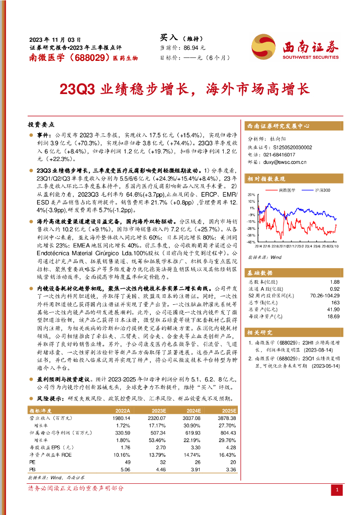西南证券:南微医学(688029)-2023年三季报点评:23Q3业绩稳步增长,海外市场高增长.pdf
