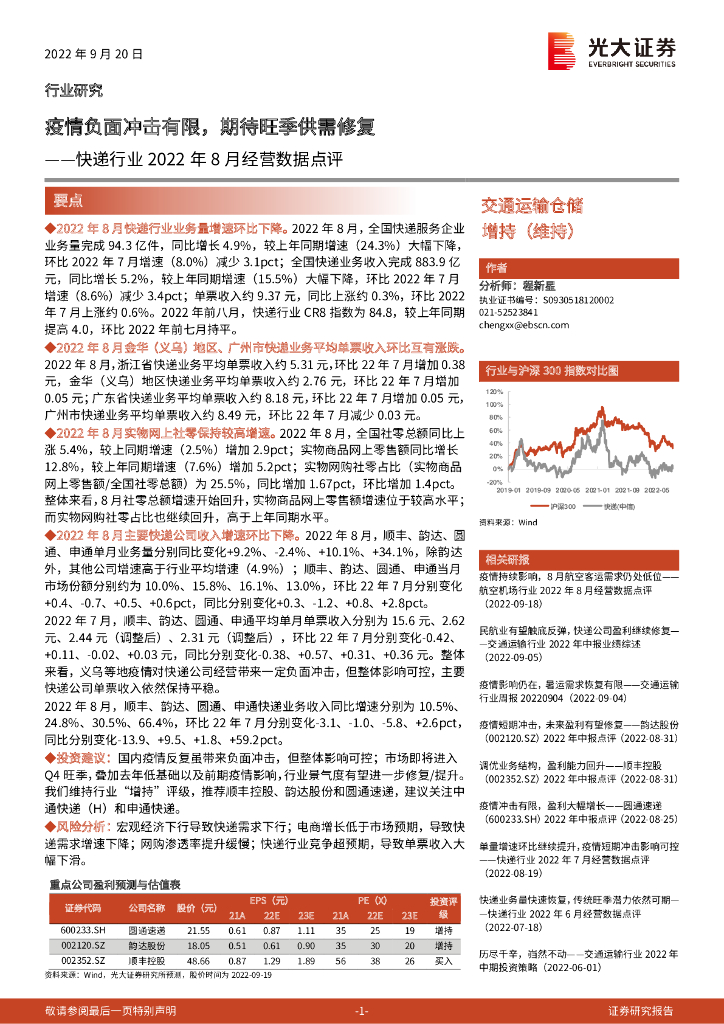 光大证券:快递行业2022年8月经营数据点评:疫情负面冲击有限,期待旺季供需修复.pdf