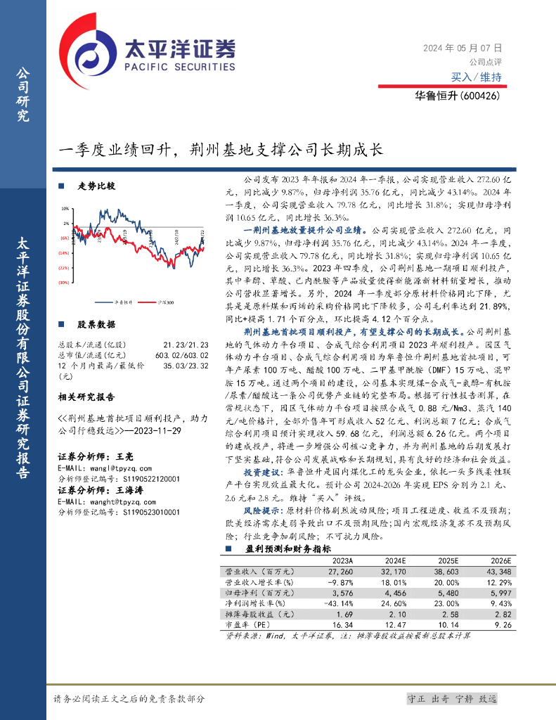 太平洋证券:华鲁恒升(600426)-一季度业绩回升,荆州基地支撑公司长期成长.pdf