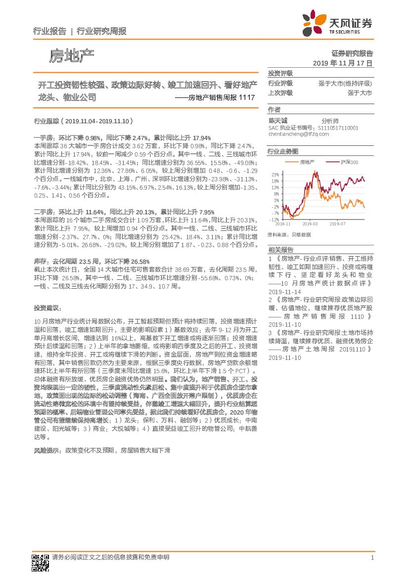 天风证券:房地产销售周报:开工投资韧性较强、政策边际好转、竣工加速回升、看好地产龙头、物业公司.pdf
