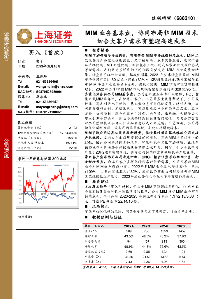 上海证券:统联精密(688210)-MIM业务基本盘,协同布局非MIM技术切合大客户需求有望迎高速成长.pdf
