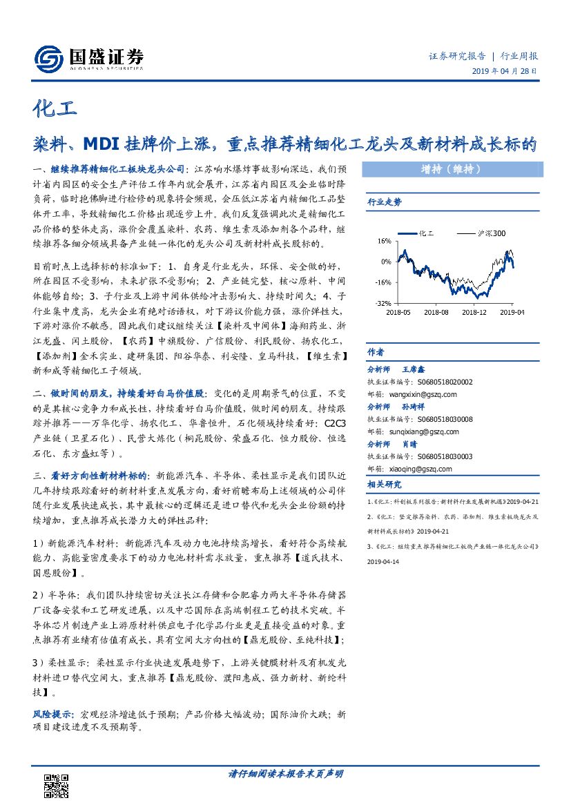 国盛证券:化工行业周报:染料、MDI挂牌价上涨,重点推荐精细化工龙头及新材料成长标的.pdf