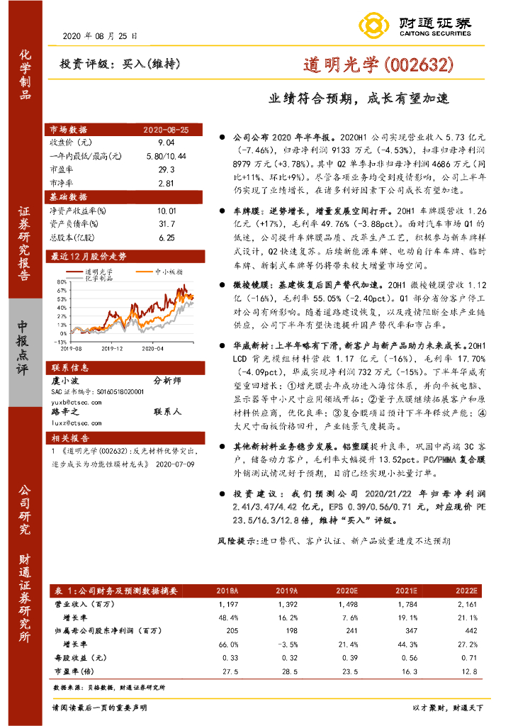 财通证券:道明光学(002632)-业绩符合预期,成长有望加速.pdf
