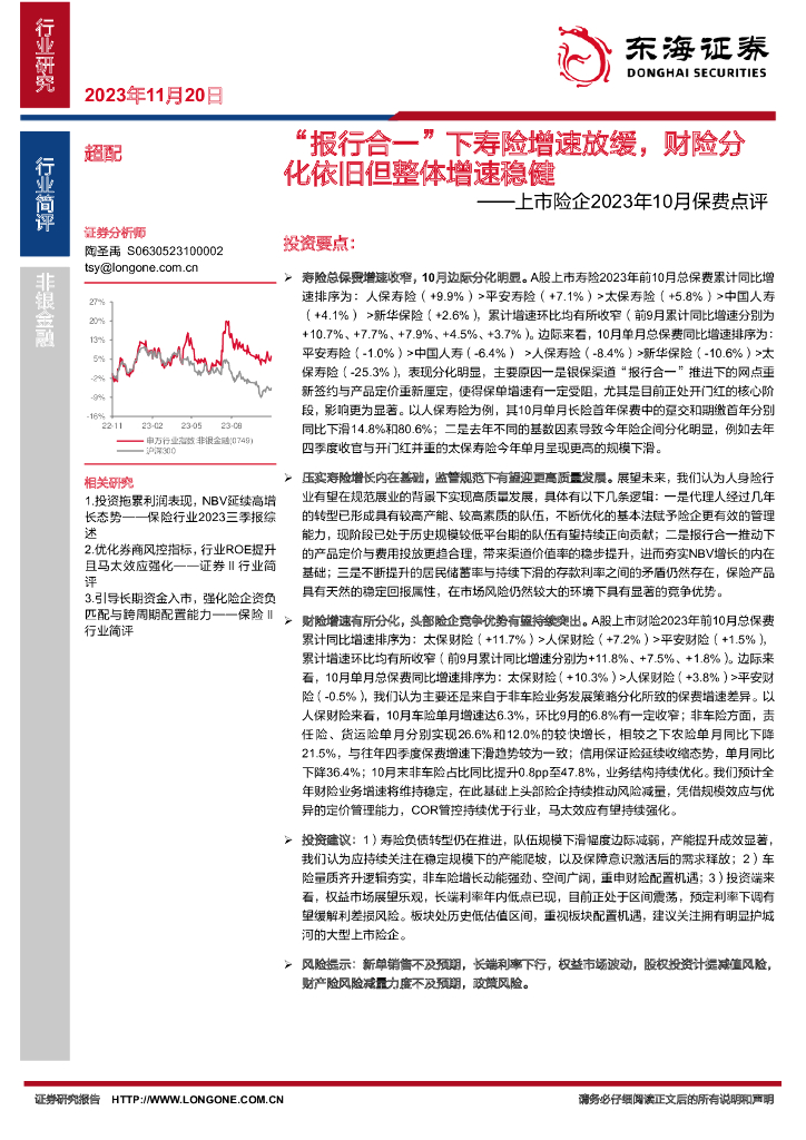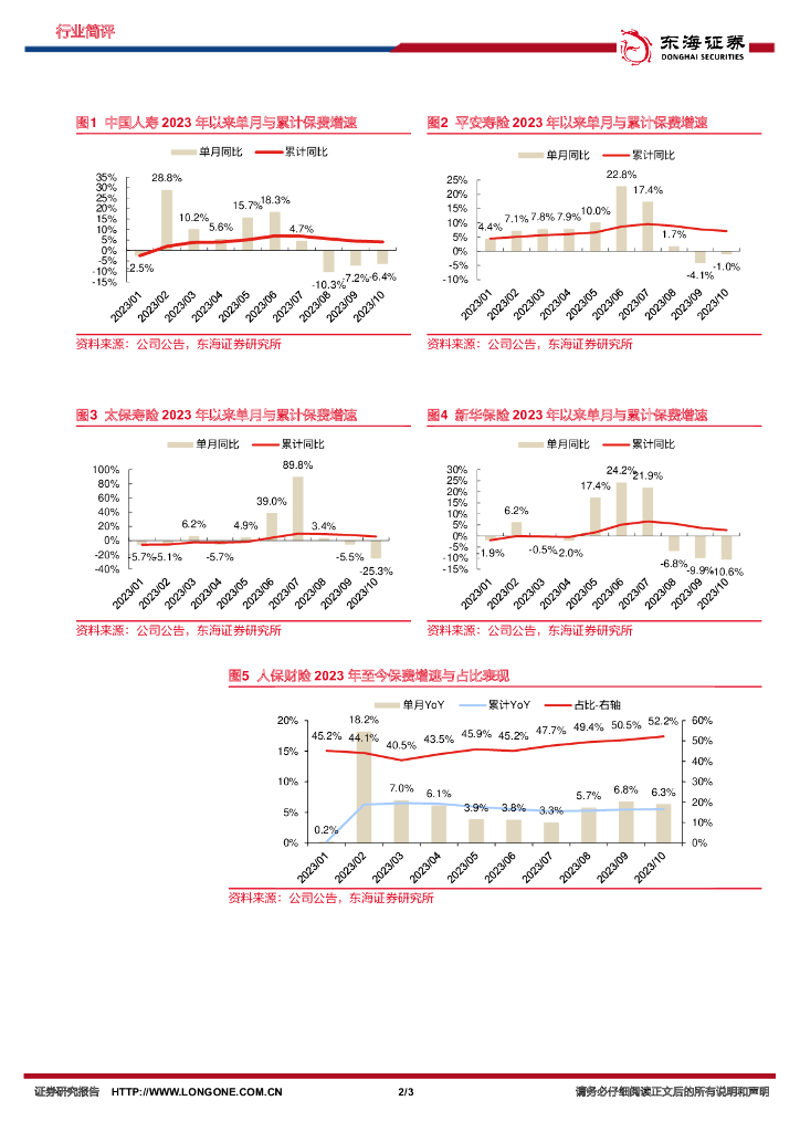 东海证券:上市险企2023年10月保费点评:“报行合一”下寿险增速放缓,财险分化依旧但整体增速稳健.pdf