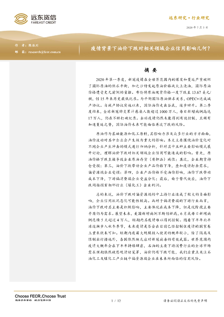 远东资信:疫情背景下油价下跌对相关领域企业信用影响几何?.pdf