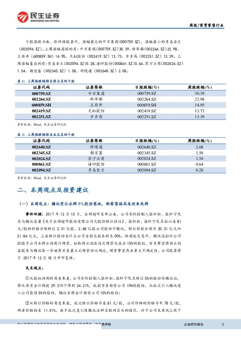民生证券:商贸零售行业周报:腾讯受让永辉5%股份落地,新零售格局或迎来洗牌.pdf