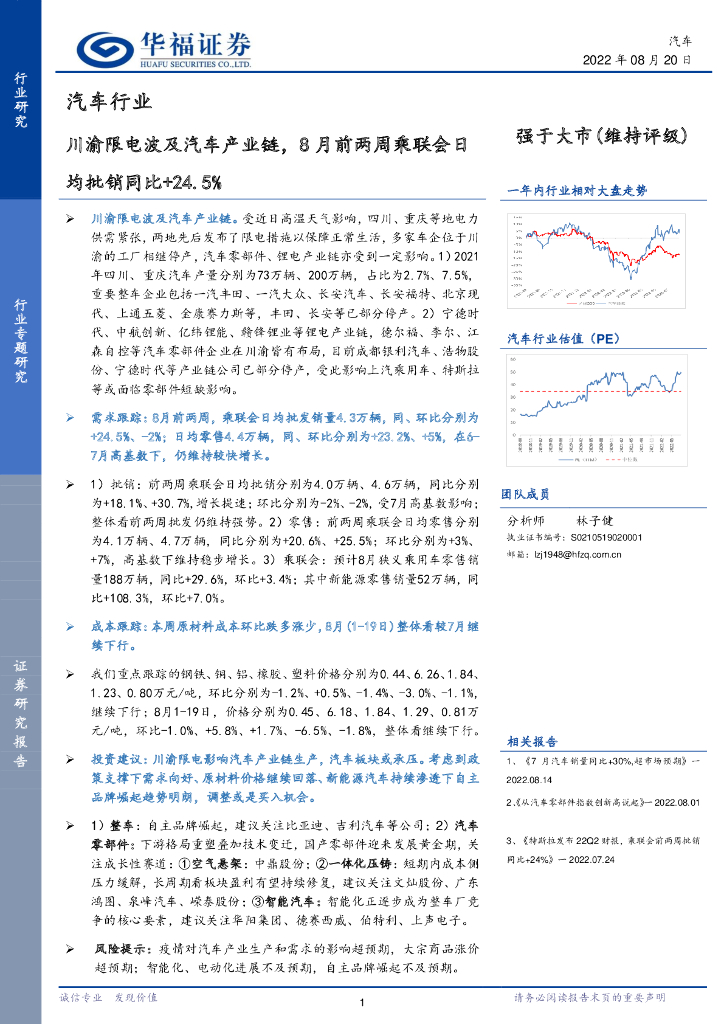 华福证券:汽车行业:川渝限电波及汽车产业链,8月前两周乘联会日均批销同比+24.5%.pdf