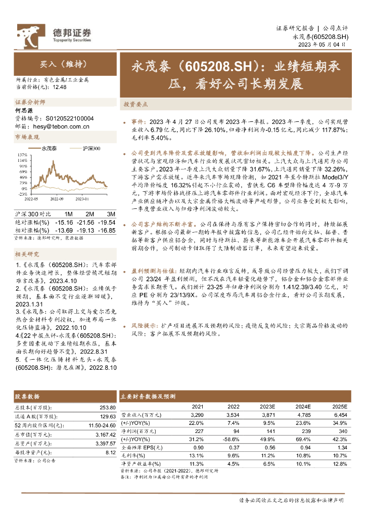 德邦证券:永茂泰(605208)-业绩短期承压,看好公司长期发展.pdf