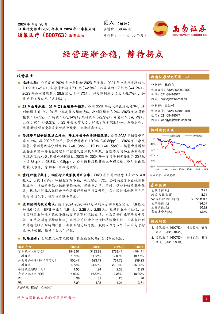 西南证券:通策医疗(600763)-经营逐渐企稳,静待拐点.pdf