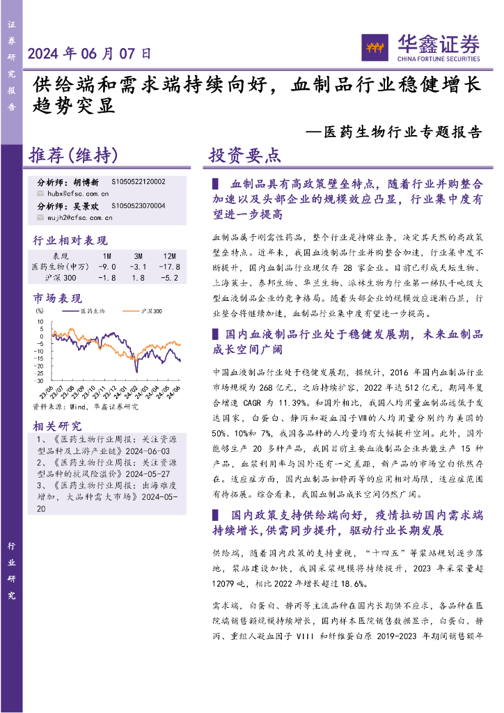 华鑫证券:医药生物行业专题报告:供给端和需求端持续向好,血制品行业稳健增长趋势突显.pdf