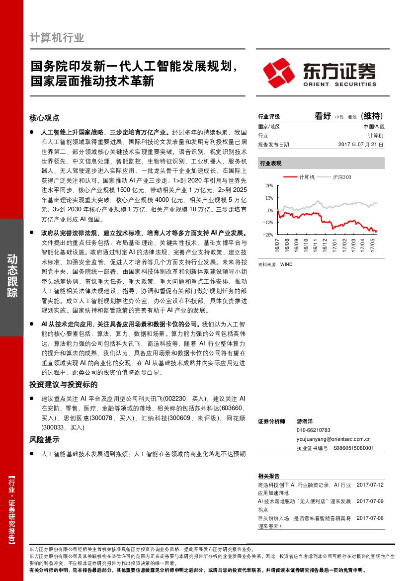 东方证券:计算机行业:国务院印发新一代人工智能发展规划,国家层面推动技术革新.pdf