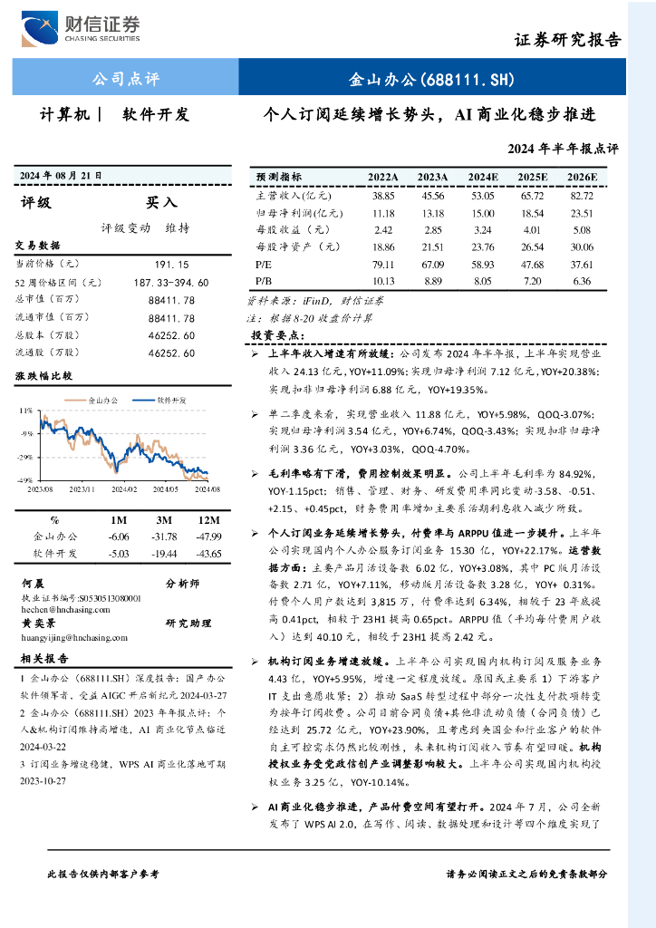 财信证券:金山办公(688111)-2024年半年报点评:个人订阅延续增长势头,AI商业化稳步推进.pdf