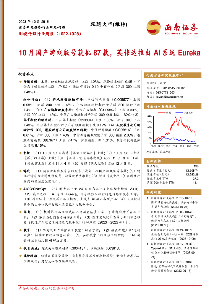 西南证券:影视传媒行业周报:10月国产游戏版号获批87款,英伟达推出AI系统Eureka.pdf