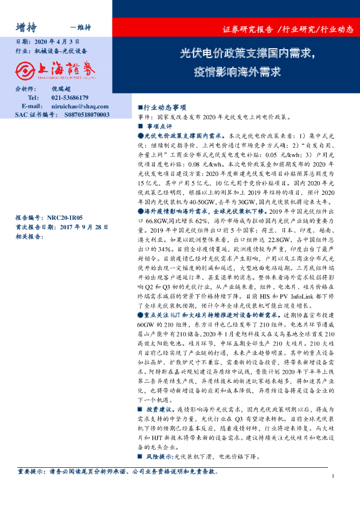 上海证券:机械设备:光伏电价政策支撑国内需求,疫情影响海外需求.pdf