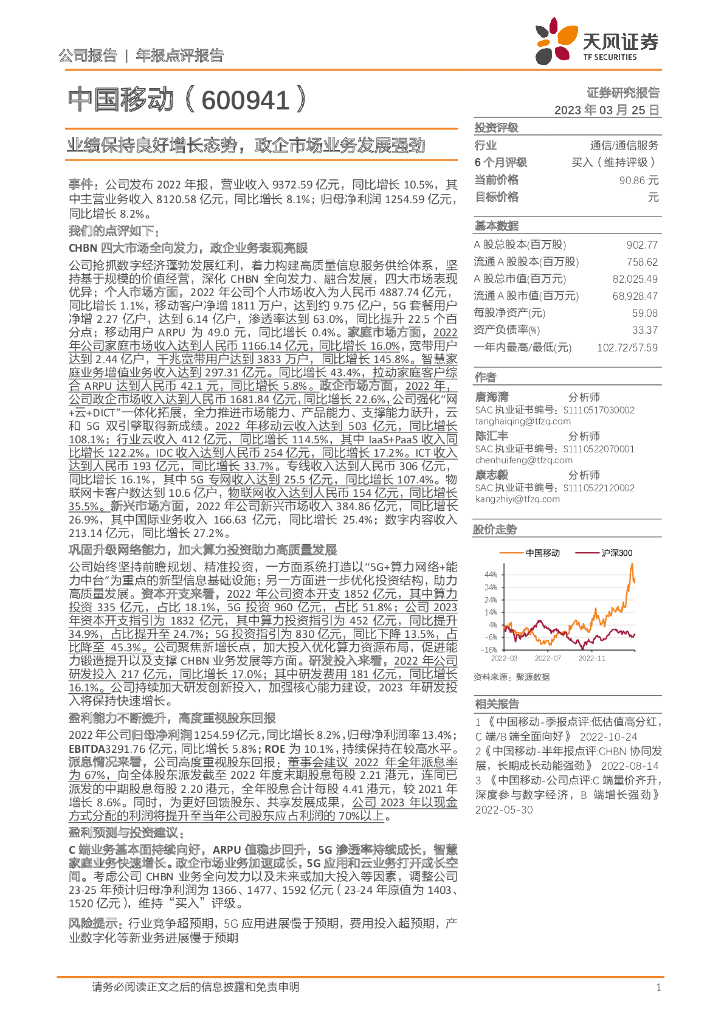 天风证券:中国移动(600941)-业绩保持良好增长态势,政企市场业务发展强劲.pdf