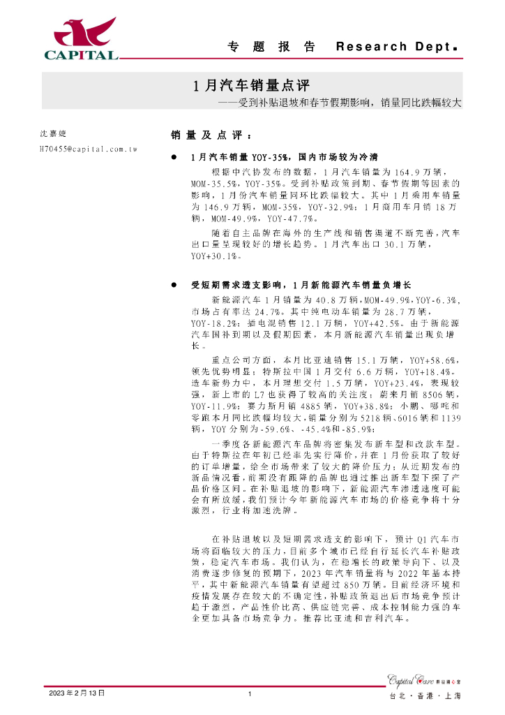 群益证券:1月汽车销量点评:受到补贴退坡和春节假期影响,销量同比跌幅较大.pdf
