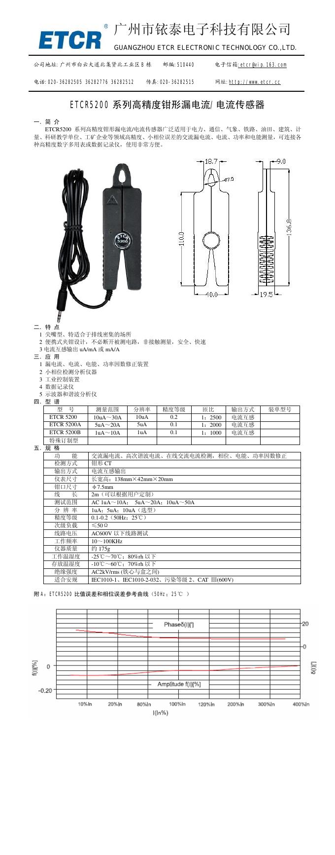广州市铱泰电子科技有限公司 ETCR5200 系列高精度钳形漏电流/电流传感器 规格手册.pdf