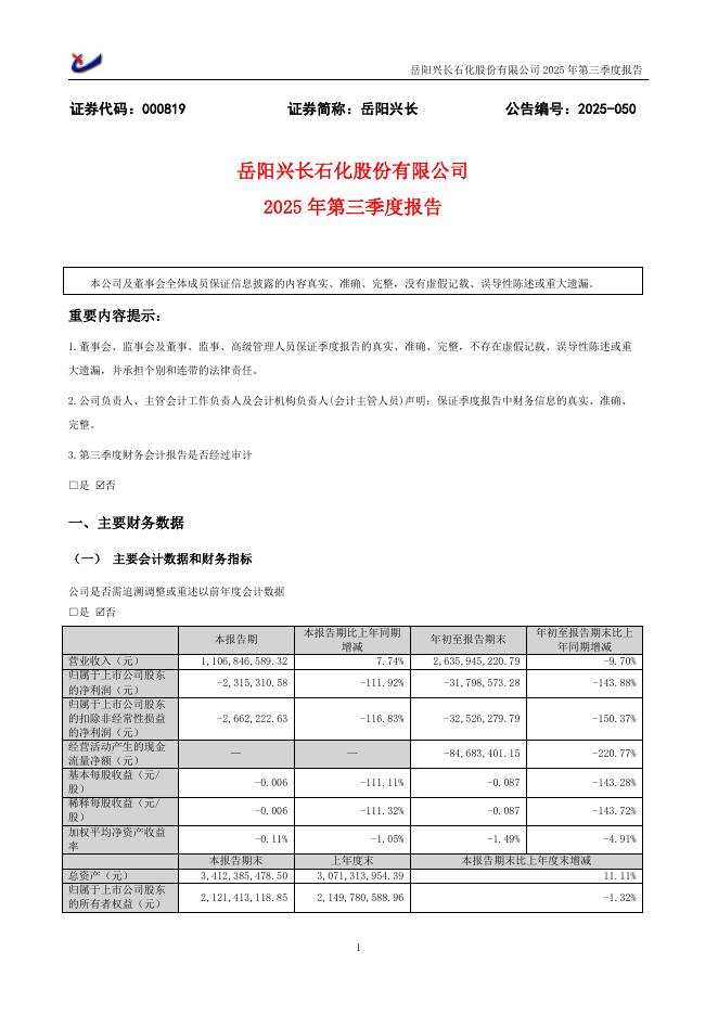 000819-岳阳兴长:2025年三季度报告.pdf