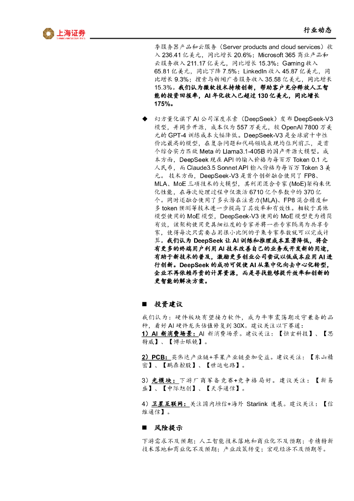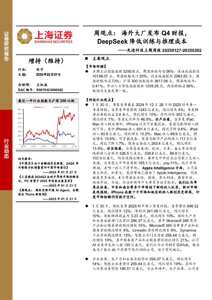 上海证券:电子行业先进科技主题周报-周观点:海外大厂发布Q4财报,DeepSeek降低训练与推理成本.pdf