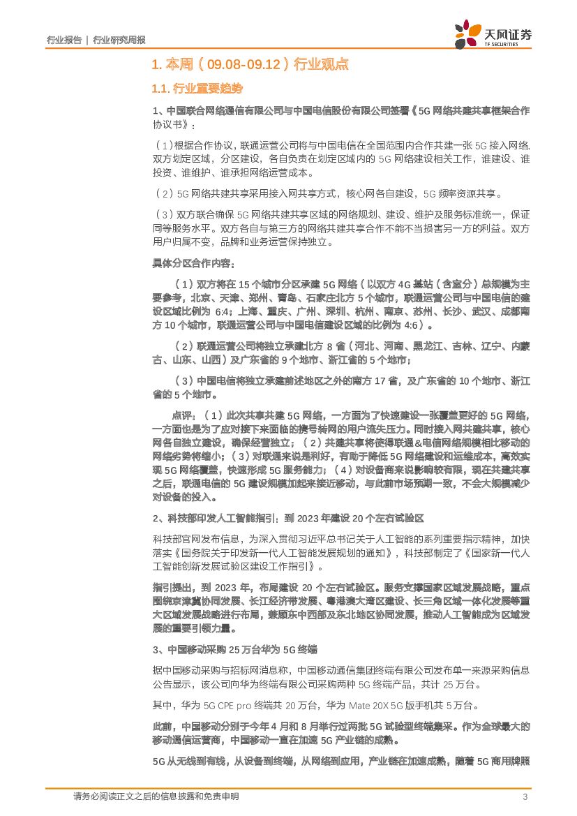 天风证券:通信行业研究周报:联通电信共建共享加速5G建设,科技部印发人工智能指引.pdf