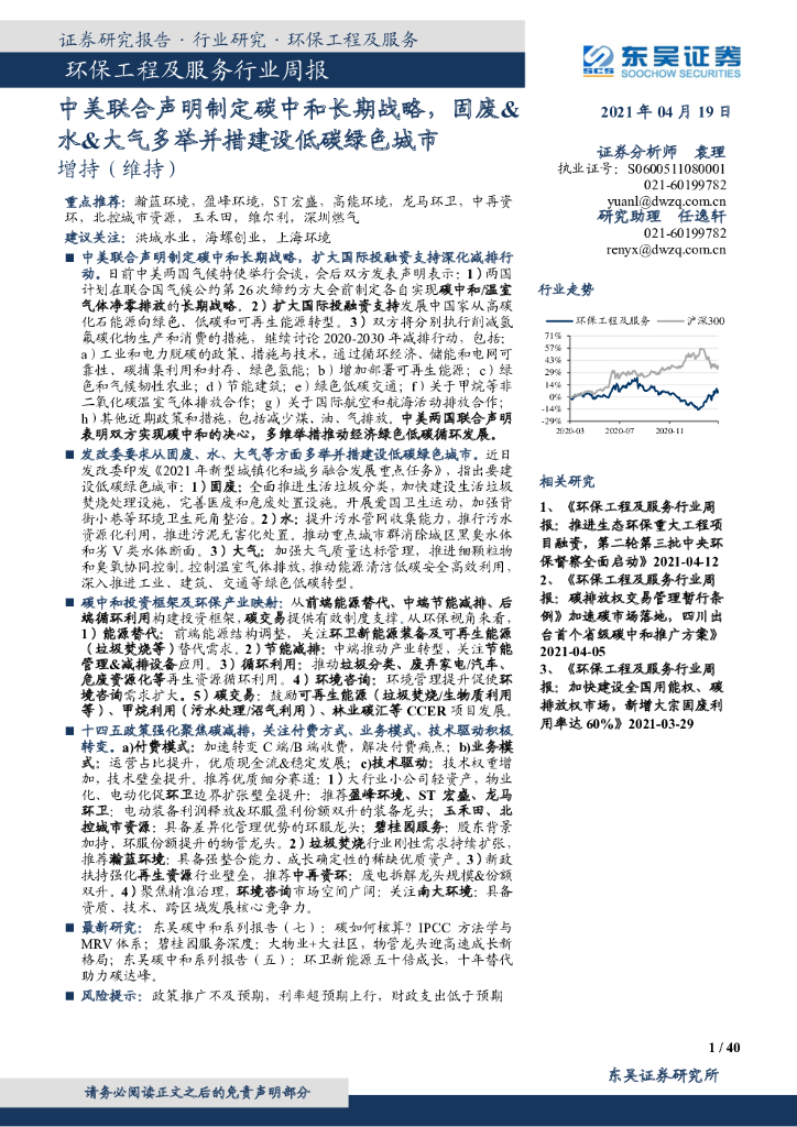 东吴证券:环保工程及服务行业周报:中美联合声明制定碳中和长期战略,固废&水&大气多举并措建设低碳绿色城市.pdf