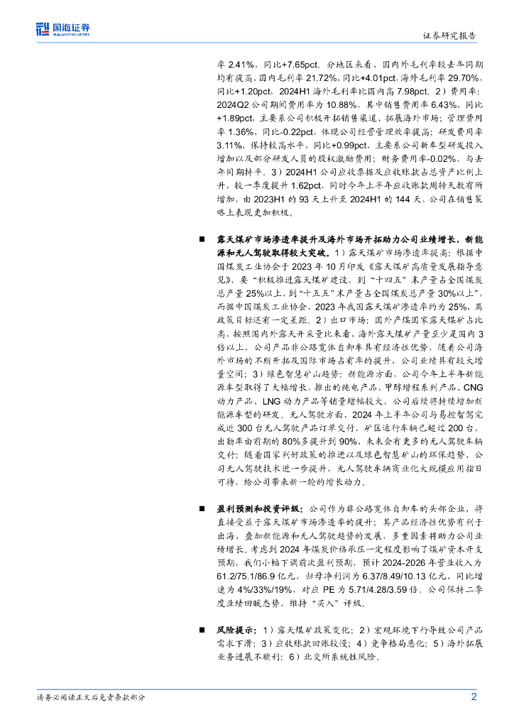 国海证券:同力股份(834599)-2024年半年报点评:2024Q2业绩恢复、单季度利润创历史最高水平,新能源和无人驾驶方向取得较大进展.pdf