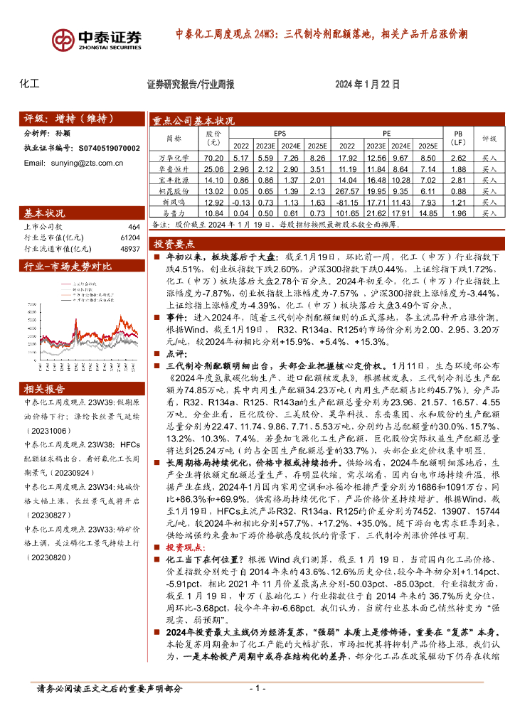 中泰证券:中泰化工周度观点24W3:三代制冷剂配额落地,相关产品开启涨价潮.pdf