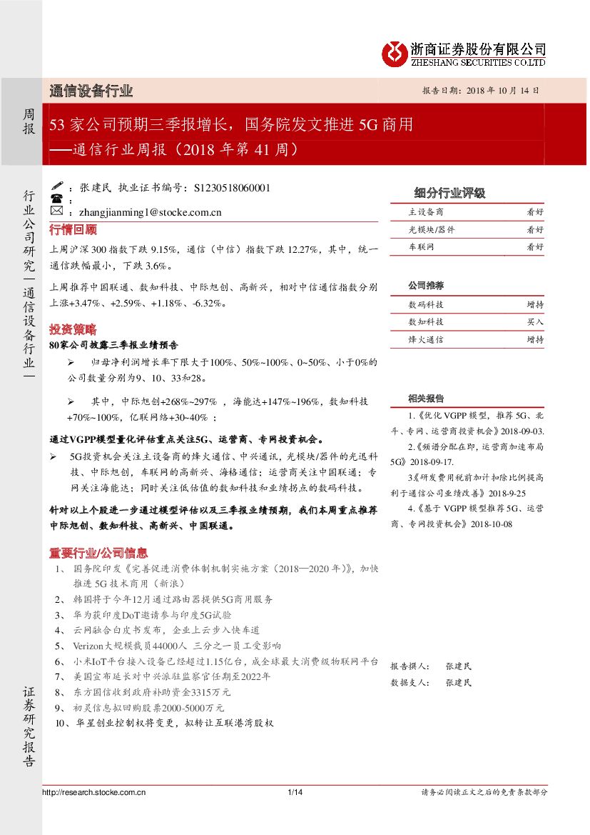 浙商证券:通信行业周报(2018年第41周):53家公司预期三季报增长,国务院发文推进5G商用.pdf