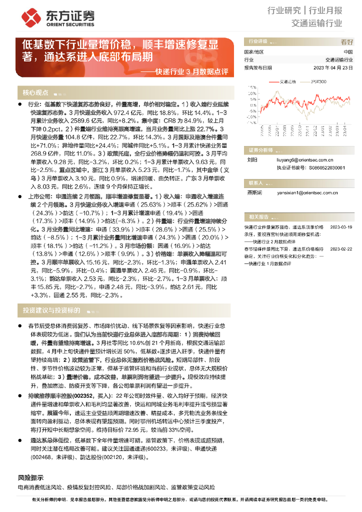 东方证券:快递行业3月数据点评:低基数下行业量增价稳,顺丰增速修复显著,通达系进入底部布局期.pdf
