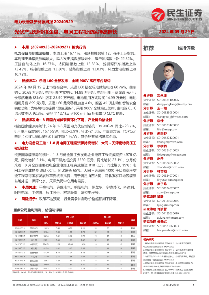民生证券:电力设备及新能源周报:光伏产业链价格企稳,电网工程投资保持高增长.pdf