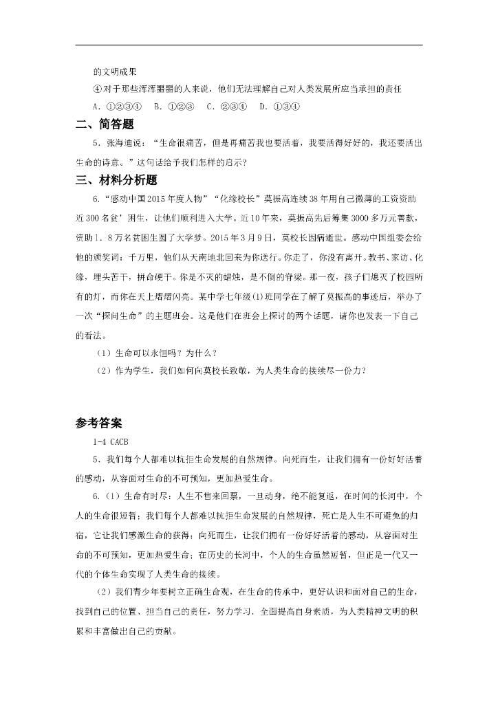 七年级上册 初中道德与法治8.1《生命可以永恒吗》同步练习.doc